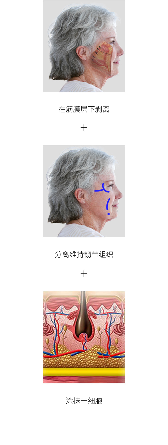 通过干细胞深层面部提升手术提拉下垂的组织,并用干细胞恢复